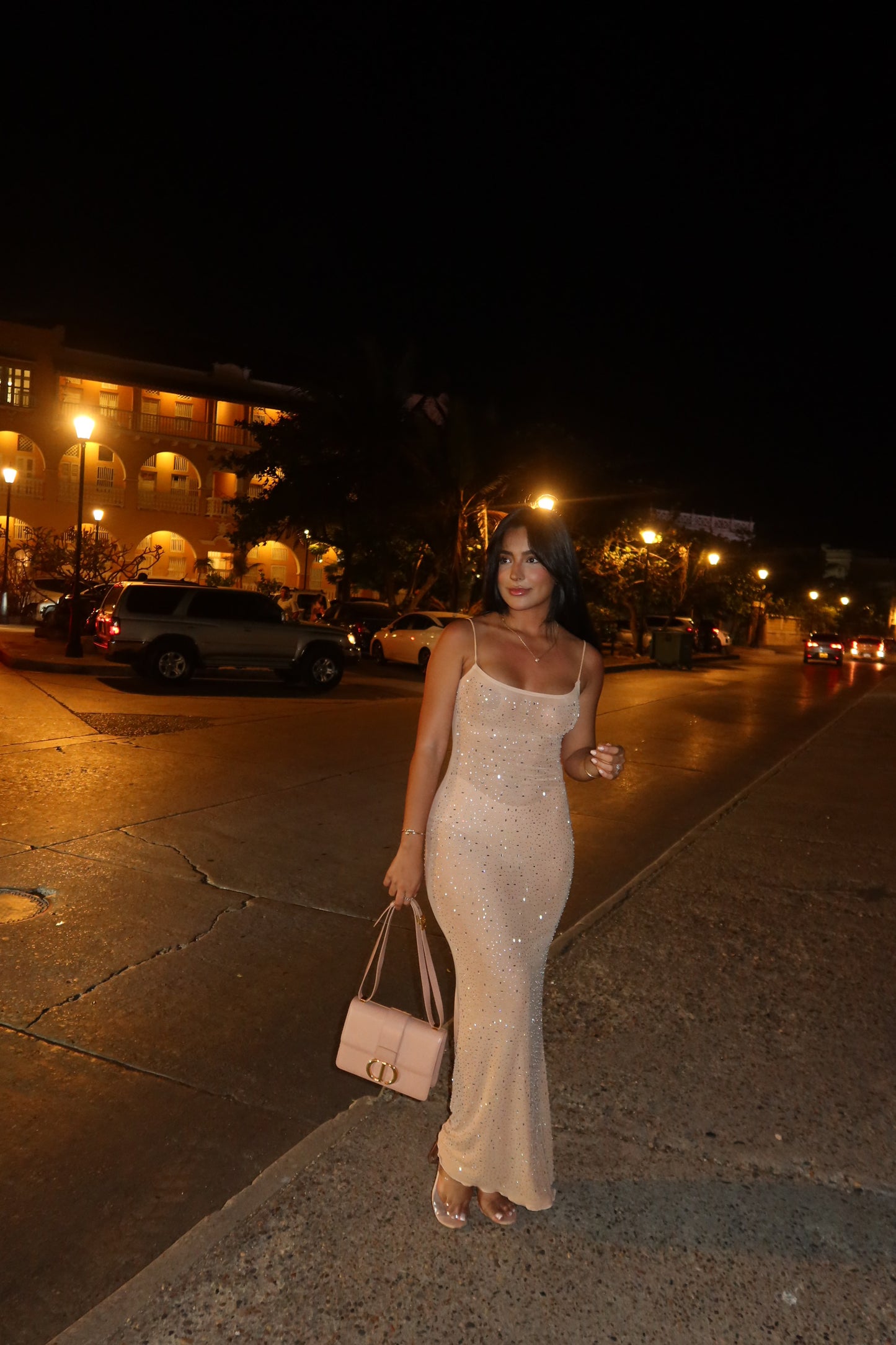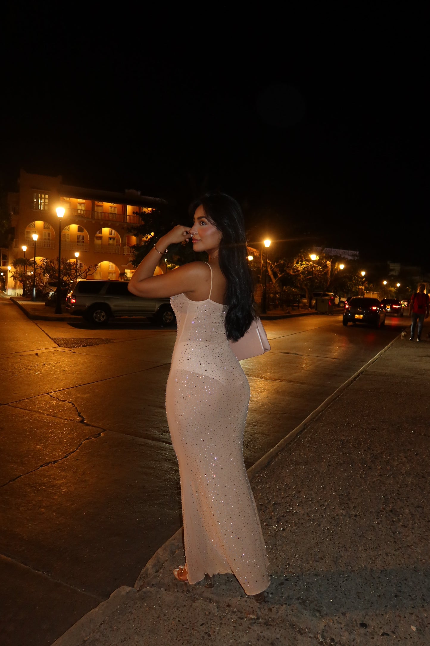 VESTIDO DALLACHAI con transparencias y delicados brillos que capturan la luz en cada movimiento. Su diseño elegante y sensual resalta la silueta de forma sutil, combinando glamour y sofisticación. Ideal para eventos de noche, alfombras rojas o cualquier ocasión donde quieras brillar con clase.”